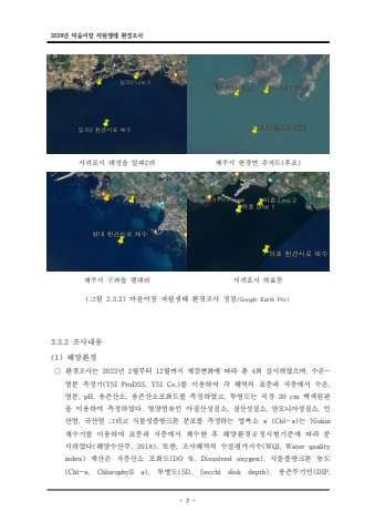2024%ub144 %ub9c8%uc744%uc5b4%uc7a5 %uc790%uc6d0%uc0dd%ud0dc %ud658%uacbd%uc870%uc0ac- 7 -%uc11c%uadc0%ud3ec%uc2dc %ub300%uc815%uc74d %uc77c%uacfc %ub9ac2 %uc81c%uc8fc%uc2dc %ud55c%uacbd%uba74 %ucd94%uc790%ub3c4( ) %ud6c4%ud3ec%uc81c%uc8fc%uc2dc %uad6c%uc88c%uc74d %ud3c9%ub300%ub9ac %uc11c%uadc0%ud3ec%uc2dc %ud558%ud6a8%ub3d9( 2.3.2) %uadf8%ub9bc %ub9c8%uc744%uc5b4%uc7a5 %uc790%uc6d0%uc0dd%ud0dc %ud658%uacbd%uc870%uc0ac %uc815%uc810(Google Earth Pro)3.3.2 %uc870%uc0ac%ub0b4%uc6a9(1) %ud574%uc591%ud658%uacbd %u25cb %ud658%uacbd%uc870%uc0ac%ub294 %ub144 2023 2 12 4 , - %uc6d4%ubd80%ud130 %uc6d4%uae4c%uc9c0 %uacc4%uc808%ubcc0%ud654%uc5d0 %ub530%ub77c %ucd1d %ud68c %uc2e4%uc2dc%ud558%uc600%uc73c%uba70 %uc218%uc628%uc5fc%ubd84 %uce21%uc815%uae30(YSI ProDSS, YSI Co.) , %ub97c %uc774%uc6a9%ud558%uc5ec %uac01 %ud574%uc5ed%uc758 %ud45c%uce35%uacfc %uc800%uce35%uc5d0%uc11c %uc218%uc628%uc5fc%ubd84 %uc6a9%uc874%uc0b0%uc18c %uc6a9%uc874 , pH, , %uc0b0%uc18c%ud3ec%ud654%ub3c4%ub97c %uce21%uc815%ud558%uc600%uace0 %ud22c%uba85%ub3c4%ub294 , 30 cm %uc9c1%uacbd %ubc31%uc0c9%uc6d0%ud310%uc744 %uc774%uc6a9%ud558%uc5ec %uce21%uc815%ud558%uc600%ub2e4. %uc601%uc591%uc5fc%ub958%uc778 %uc544%uc9c8%uc0b0%uc131%uc9c8%uc18c, %uc9c8%uc0b0%uc131%uc9c8%uc18c, , %uc554%ubaa8%ub2c8%uc544%uc131%uc9c8%uc18c %uc778%uc0b0%uc5fc, %uaddc%uc0b0%uc5fc %uadf8%ub9ac%uace0 %uc2dd%ubb3c%uc131%ud50c%ub791%ud06c%ud1a4 %ubd84%ud3ec%ub97c %uce21%uc815%ud558%ub294 %uc5fd%ub85d%uc18c a (Chl-a)%ub294 Niskin %ucc44%uc218%uae30%ub97c %uc774%uc6a9%ud558%uc5ec %ud45c%uce35%uacfc %uc800%uce35%uc5d0%uc11c %ucc44%uc218%ud55c %ud6c4 %ud574%uc591%ud658%uacbd%uacf5%uc815%uc2dc%ud5d8%uae30%uc900%uc5d0 %ub530%ub77c %ubd84%uc11d%ud558%uc600%ub2e4 %ud574%uc591%uc218%uc0b0%ubd80 ( , 2018). , ( %ub610%ud55c %uc870%uc0ac%ud574%uc5ed%uc758 %uc218%uc9c8%ud3c9%uac00%uc9c0%uc218 WQI, Water qualityindex) (DO %, Dissolved o %uacc4%uc0b0%uc740 %uc800%uce35%uc0b0%uc18c %ud3ec%ud654%ub3c4 xygen), %uc2dd%ubb3c%ud50c%ub791%ud06c%ud1a4 %ub18d%ub3c4(Chl-a, Chlorophyll a), (SD, Secchi disk dep %ud22c%uba85%ub3c4 %uc6a9%uc874 th), (D %ubb34%uae30%uc778 IP,