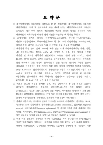 - i -%uc694 %uc57d %ubb38%u25cc %uc81c%uc8fc%ud2b9%ubcc4%uc790%uce58%ub3c4 %ub9c8%uc744%uc5b4%uc7a5%uc744 %ub300%uc0c1%uc73c%ub85c %ud55c %ubcf8 %uc0dd%ud0dc%uc870%uc0ac%ub294 %uc81c%uc8fc%ud2b9%ubcc4%uc790%uce58%ub3c4 %ub9c8%uc744%uc5b4%uc7a5 %uc790%uc6d0%uc0dd%ud0dc%ud658%uacbd %uc870%uc0ac %ubc0f %uad00%ub9ac%uc870%ub840%uc5d0 %ub530%ub978 %uc81c %ucc28 %uac1c%ub144 %ud574%uc591%uc0dd%ud0dc%uc870%uc0ac%uacc4%ud68d %ucc28%ub144%ub3c4 45 2%uc870%uc0ac%ub85c%uc11c %uc81c%uc8fc %uc5f0%uc548 %ud574%uc5ed%uc758 %uc0dd%ubb3c%ub2e4%uc591%uc131 %ubcc0%ud654%uc640 %uc0dd%ud0dc%uacc4 %ud2b9%uc131%uc744 %ubd84%uc11d%ud558%uc5ec %uc9c0%uc5ed , %ud574%uc591%uc790%uc6d0%uc758 %uc9c0%uc18d%uac00%ub2a5%ud55c %uc774%uc6a9%uacfc %uad00%ub9ac %uae30%ubc18%uc744 %ub9c8%ub828%ud558%ub294 %ub370 %ubaa9%uc801%uc744 %ub450%uc5c8%ub2e4.%u25cc %uc870%uc0ac%uc9c0%uc5ed%uc740 %ub3d9%ubd81%ubd80 %ud3c9%ub300%ub9ac %uc11c%ubd81%ubd80 %uc774%ud638 %uace0%ub0b4 %uace0%uc0b0 %ub3d9%ub0a8%ubd80 %uc2e0%ucc9c %uc704%ubbf8 %ud558%ud6a8 , ( %u00b7 %u00b7 ), ( , 2%u00b7 ), %uc11c%ub0a8%ubd80 %ubc95%ud658 %uc77c%uacfc %ubd80%uc18d%ub3c4%uc11c%uc778 %ucd94%uc790 %ub4f1 %ucd1d %uac1c %ub9c8%uc744%uc5b4%uc7a5%uc744 %uc870%uc0ac%ud558%uc600%uc73c%uba70 ( %u00b7 2), ( ) 10 , %uacc4%uc808%ubcc4 %uc218%uc9c8 %ud574%uc870%ub958 %uc800%uc11c%ub3d9%ubb3c %ub4f1%uc758 %uc885 %uad6c%uc131%uacfc %ubd84%ud3ec %ud2b9%uc131%uc744 %uc870%uc0ac%ud558%uc600%ub2e4 , , .%u25cc %ud574%uc591%ud658%uacbd %ud2b9%uc131 %ubd84%uc11d %uacb0%uacfc %ub144 %uc81c%uc8fc %uc5f0%uc548 %uac1c %ub9c8%uc744%uc5b4%uc7a5%uc5d0%uc11c%ub294 %uc218%uc628 %uc5fc%ubd84 , 2024 10 , , pH, (DO), -a(Chl-a), %uc6a9%uc874%uc0b0%uc18c %uc5fd%ub85d%uc18c %ud22c%uba85%ub3c4 %ub4f1 %uc8fc%uc694 %uc218%uc9c8 %ud56d%ubaa9%uc5d0 %ub69c%ub837%ud55c %uacc4%uc808%ubcc4 %ubc0f %ud574%uc5ed%ubcc4 %ubcc0%ub3d9%uc131%uc774 %uad00%ucc30%ub418%uc5c8%ub2e4 %uc218%uc628%uc740 %ubd84%uae30 %ud3c9%uade0 %ubd84%uae30 . 1 14.9 , 2 %u210316.8 , 3 23.6 , 4 24.6 , 3 %u2103%u2103%u2103 %ubd84%uae30 %ubd84%uae30 %ub85c %uc99d%uac00%ud558%uc600%uc73c%uba70 %ud2b9%ud788 %ubd84%uae30%uc5d0%ub294 %ucd94%uc790%ub3c4%uc640 %uc2e0%ucc9c %ud574%uc5ed%uc5d0%uc11c %uace0%uc628 %ud604%uc0c1%uc774 %uad00%uce21%ub418%uc5c8%ub2e4 %uc5fc%ubd84 %ub18d%ub3c4%ub294 %ubd84%uae30%uc5d0 %uc800%uc5fc%ubd84 %ud604%uc0c1%uc774 . 3%ub098%ud0c0%ub0ac%uace0 %uc5ec%ub984%ucca0%uc5d0%ub294 %uc5fc%ubd84 %ucc28%uc774%uc5d0 %uc758%ud55c %ubc00%ub3c4 %ucc28%uc774%uac00 %uc9c0%uc5ed%ubcc4%ub85c %ub2e4%ub974%uac8c %ub098%ud0c0%ub0ac%ub2e4 , . pH 8.1~8.2 , 1 7.3 mg/L 4 6.8 %ub294 %ub85c %uc548%uc815%uc801%uc774%uc5c8%uc73c%uba70 %uc6a9%uc874%uc0b0%uc18c%ub294 %ubd84%uae30 %uc5d0%uc11c %ubd84%uae30 mg/L . -a 2 3 %ub85c %uacc4%uc808%ubcc4%ub85c %uac10%uc18c%ud588%ub2e4 %uc5fd%ub85d%uc18c %ub18d%ub3c4%ub294 %ubd84%uae30%uc5d0 %uae09%uc99d%ud55c %ub4a4 %ubd84%uae30%uc640 4 . , %ubd84%uae30%uc5d0%ub294 %uac10%uc18c%ud558%uc600%ub2e4 %ud574%uc218 %ud22c%uba85%ub3c4%ub294 %uc804%ubc18%uc801%uc73c%ub85c %uc0c1%uc2b9%ud558%ub294 %uacbd%ud5a5%uc744 %ubcf4%uc600%uace04 12.4m . %ubd84%uae30%uc5d0%ub294 %ub85c %uac00%uc7a5 %ub192%uc740 %uac12%uc744 %uae30%ub85d%ud558%uc600%ub2e4%u25cc %ud574%uc870%ub958 %uc885%uc870%uc131 %ud2b9%uc131%uc744 %ubd84%uc11d%ud55c %uacb0%uacfc, %uc81c%uc8fc %uc5f0%uc548%uc5d0%uc11c%ub294 %ucd1d %uac1c %ubd84%ub958%uad70 %uc885%uc758 3 142%ud574%uc870%ub958%uac00 %ucd9c%ud604%ud558%uc600%uc73c%uba70 %ud64d%uc870%ub958%uac00 %uc885 %uc73c%ub85c %uac00%uc7a5 %ub9ce%uc558%uace0 %uac08%uc870%ub958 , 100 (70.4%) , 24 (16.9%), 18 (12.7%) . %uc885 %ub179%uc870%ub958 %uc885 %uc774 %ub4a4%ub97c %uc774%uc5c8%ub2e4 %uc9c0%uc5ed%ubcc4%ub85c%ub294 %ud3c9%ub300%ub9ac%uc5d0%uc11c %uac00%uc7a5 %ub9ce%uc740 136 , 2 88 . %uc885%uc774 %ud655%uc778%ub418%uc5c8%uace0 %uc704%ubbf8 %ub9ac%uc5d0%uc11c %uac00%uc7a5 %uc801%uc740 %uc885%uc774 %ucd9c%ud604%ud558%uc600%ub2e4 %uacc4%uc808%ubcc4 %ucd9c%ud604 %uc885%uc218%ub294 %ucd98%uacc4%uac00 %uac00%uc7a5 %ub9ce%uc558%uc73c%uba70 %uc804%uccb4%uc801%uc73c%ub85c %ud64d%uc870%ub958%uc758 %uc6b0%uc810 %uacbd%ud5a5%uc774 %ub450%ub4dc%ub7ec%uc84c%ub2e4 , .%u25cc %uc0dd%uccb4%ub7c9 %uae30%uc900%uc73c%ub85c%ub294 %ud64d%uc870%ub958%uac00 %uc804%uccb4%uc758 %ub97c %ucc28%uc9c0%ud558%uba70 %uc6b0%uc810%ud558%uc600%uace0 %uac08%uc870%ub958%ub294 73.9% , 14.4%, %ub179%uc870%ub958%ub294 %uc218%uc900%uc774%uc5c8%ub2e4 %ub458%ub808%ud639%uc0b0%ud638%ub9d0 %ub113%uc740%uac8c%ubc1c 5.2% . (Corallina crassisima), (Amphiroa anceps), (Amphiroa ephedraea) 3 %uc5d0%ud398%ub4dc%ub77c%uac8c%ubc1c %ub4f1 %ud64d%uc870%ub958 %uc885%uc774 %uc804%uccb4 %uc0dd%uccb4%ub7c9%uc758 %uc808%ubc18 %uc774%uc0c1%uc744 %ucc28%uc9c0%ud558%uc600%ub2e4 %uac10%ud0dc %ud070%uc5f4%ub9e4%ubaa8%uc790%ubc18 %ub4f1 . (Ecklonia cava), (Sargassum macrocarpum) %uc77c%ubd80 %uac08%uc870%ub958%ub3c4 %uc77c%uc815%ud55c %ube44%uc911%uc744 %ubcf4%uc600%uc73c%ub098 %uc0dd%uccb4%ub7c9%uc740 %uc0c1%ub300%uc801%uc73c%ub85c %ub0ae%uc558%ub2e4.%u25cc %ud558%uacc4 %uc774%ud6c4 %uac08%uc870%ub958%uc758 %uc0dd%uccb4%ub7c9%uc740 %ud604%uc800%ud788 %uac10%uc18c%ud558%uc600%uace0 %ud2b9%ud788 %ub3d9%ub0a8%ubd80 %uc2e0%ucc9c %uc704%ubbf8 %ud558%ud6a8 %uc640 , ( %u00b7 2%u00b7 )%uc11c%ub0a8%ubd80 %ubc95%ud658 %uc77c%uacfc %uc9c0%uc5ed%uc5d0%uc11c%ub294 %uac08%uc870%ub958%uc758 %ucd9c%ud604%uc774 ( %u00b7 2) %uac70%uc758 %uc5c6%uac70%ub098 %uad70%uc9d1 %uc790%uccb4%uac00 %uc5c6%uc5b4%uc9c0%ub294 %ud604%uc0c1%uc774 %uad00%ucc30%ub418%uc5c8%uc73c%uba70 %uc218, (3~6m) %uc2ec%ubcc4%ub85c%ub294 %uc5f0%uc548%ub300 %uc5d0%uc11c %uc0dd%uccb4%ub7c9%uacfc %uc885 %ub2e4%uc591%uc131%uc774 %uac00%uc7a5