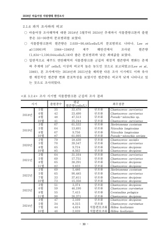 2024%ub144 %ub9c8%uc744%uc5b4%uc7a5 %uc790%uc6d0%uc0dd%ud0dc %ud658%uacbd%uc870%uc0ac- 30 -2.1.6 %uacfc%uac70 %uc870%uc0ac%uc640%uc758 %ube44%uad50%u25cb %ub9c8%uc744%uc5b4%uc7a5 %uc870%uc0ac%ud574%uc5ed%uc5d0 %ub300%ud55c %ub144 2018 5 2024 %uc6d4%ubd80%ud130 %ub144 %ucd94%uacc4%uae4c%uc9c0 %uc2dd%ubb3c%ud50c%ub791%ud06c%ud1a4%uc758 %ucd9c%ud604%uc885%uc740 %uc885%uc758 %ubd84%ud3ec 33~90 . %ubc94%uc704%ub97c %ubcf4%uc600%ub2e4%u25cb %uc2dd%ubb3c%ud50c%ub791%ud06c%ud1a4%uc758 %ud604%uc874%ub7c9%uc740 %uc758 %ubd84%ud3ec 2,039~90,485cells/L , Lee %ubc94%uc704%ub85c %ub098%ud0c0%ub098 etal.(1990) 1988~1989 %uc758 %ub144 %uc81c%uc8fc %ud574%uc548%uc120%uc5d0%uc11c %uc870%uc0ac%ub41c %ud604%uc874%ub7c9(1,834~1,190,044cells/L) . %ubcf4%ub2e4 %uc881%uc740 %ubd84%ud3ec%ubc94%uc704%uc640 %ub0ae%uc740 %ucd5c%ub300%uac12%uc744 %ubcf4%uc600%ub2e4%u25cb %uc77c%ubc18%uc801%uc73c%ub85c %uc81c%uc8fc%ub3c4 %uc5f0%uc548%ud574%uc5ed%uc758 %uc2dd%ubb3c%ud50c%ub791%ud06c%ud1a4 %uad70%uc9d1%uc758 %uacc4%uc808%uc801 %ud604%uc874%ub7c9%uc758 %ubcc0%ud654%ub294 %ucd98%uacc4%uc640 %ucd94%uacc4%uc5d0 105 cells/L (Lee %uc774%uc0c1%uc758 %ube44%uad50%uc801 %ub192%uc740 %ub18d%ub3c4%uc778 %uac83%uc73c%ub85c %ubcf4%uace0%ub418%uc5c8%uace0 et al., 1989), 2018 2021 %ubcf8 %uc870%uc0ac%uc5d0%uc11c%ub294 %ub144%uacfc %ub144%uc744 %uc81c%uc678%ud55c %ub2e4%ub978 %uc870%uc0ac %uc2dc%uae30%uc5d0%ub3c4 %uc774%uc640 %uc720%uc0ac%ud55c %uacc4%uc808%uc801%uc778 %ud604%uc874%ub7c9 %ubcc0%ud654 %ubd84%ud3ec%ud2b9%uc131%uc744 %ubcf4%uc600%uc9c0%ub9cc %ud604%uc874%ub7c9%uc740 %ube44%uad50%uc801 %ub0ae%uac8c %ub098%ud0c0%ub098%uace0 %uc788%ub294 %uac83%uc73c%ub85c %uc870%uc0ac%ub418%uc5c8%ub2e4.%uc2dc%uae30 %ucd9c%ud604%uc885%uc218 %ud3c9%uade0 %ud604%uc874%ub7c9(cells/L) %ucd5c%uc6b0%uc810%uc8852018%ub1445%uc6d4 35 32,470 %uaddc%uc870%ub958 Chaetoceros curvisetus6%uc6d4 42 23,490 %uaddc%uc870%ub958 Chaetoceros curvisetus8%uc6d4 48 47,513 %uaddc%uc870%ub958 Pseudo-nitzschia sp.10%uc6d4 41 25,244 %uaddc%uc870%ub958 Chaetoceros curvisetus2019%ub1443%uc6d4 67 61,532 %uaddc%uc870%ub958 Skeletonema costatum5%uc6d4 64 13,891 %uaddc%uc870%ub958 Nitzschia longissima8%uc6d4 67 9,756 %uaddc%uc870%ub958 Nitzschia longissima10%uc6d4 87 61,095 %uaddc%uc870%ub958 Pseudo-nitzschia seriata2020%ub1442%uc6d4 79 18,430 %uaddc%uc870%ub958 Chaetoceros socialis5%uc6d4 70 39,547 %uaddc%uc870%ub958 Chaetoceros curvisetus8%uc6d4 65 9,724 %uaddc%uc870%ub958 Chaetoceros decipiens10%uc6d4 85 8,562 %uaddc%uc870%ub958 Chaetoceros decipiens2021%ub1443%uc6d4 64 31,164 %uaddc%uc870%ub958 Chaetoceros curvisetus5%uc6d4 69 17,751 %uaddc%uc870%ub958 Chaetoceros curvisetus8%uc6d4 65 38,291 %uaddc%uc870%ub958 Chaetoceros decipiens11%uc6d4 82 9,833 %uaddc%uc870%ub958 Chaetoceros decipiens2022%ub1442%uc6d4 69 5,486 %uaddc%uc870%ub958 Skeletonema costatum5%uc6d4 65 90,485 %uaddc%uc870%ub958 Chaetoceros curvisetus7%uc6d4 33 37,811 %uaddc%uc870%ub958 Chaetoceros decipiens10%uc6d4 73 15,356 %uaddc%uc870%ub958 Chaetoceros decipiens2023%ub1443%uc6d4 51 3,374 %uaddc%uc870%ub958 Chaetoceros decipiens6%uc6d4 59 46,190 %uaddc%uc870%ub958 Chaetoceros curvisetus8%uc6d4 55 7,415 %uaddc%uc870%ub958 Cerataulina pelagica11%uc6d4 90 26,371 %uaddc%uc870%ub958 Chaetoceros decipiens2024%ub1443%uc6d4 47 2,109 %uaddc%uc870%ub958 Chaetoceros decipiens5%uc6d4 34 8,315 %uaddc%uc870%ub958 Chaetoceros curvisetus7%uc6d4 44 4,624 %uc2dd%ubb3c%ud3b8%ubaa8%uc870%ub958 Hillea fusiformis10%uc6d4 46 2,039 %uc2dd%ubb3c%ud3b8%ubaa8%uc870%ub958 Hillea fusiformis<%ud45c %uc870%uc0ac 3.2.4> %uc2dc%uae30%ubcc4 %uc2dd%ubb3c%ud50c%ub791%ud06c%ud1a4 %uad70%uc9d1%uc758 %uc870%uc0ac %uacb0%uacfc