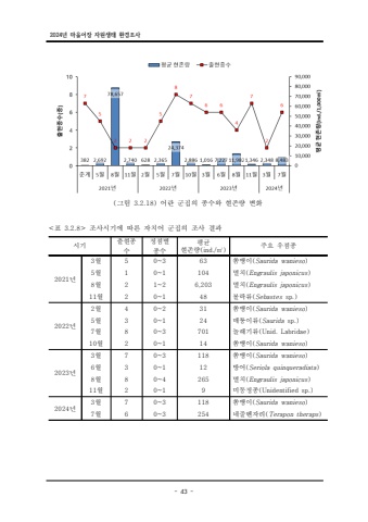 2024%ub144 %ub9c8%uc744%uc5b4%uc7a5 %uc790%uc6d0%uc0dd%ud0dc %ud658%uacbd%uc870%uc0ac- 43 -%uc2dc%uae30 %ucd9c%ud604%uc885%uc218%uc815%uc810%ubcc4 %uc885%uc218%ud3c9%uade0 %ud604%uc874%ub7c9(ind./ ) %u33a5 %uc8fc%uc694 %uc6b0%uc810%uc8852021%ub1443%uc6d4 5 0~3 63 %uc3e8%ubc45%uc774(Saurida wanieso)5%uc6d4 1 0~1 104 %uba78%uce58(Engraulis japonicus)8%uc6d4 2 1~2 6,203 %uba78%uce58(Engraulis japonicus)11%uc6d4 2 0~1 48 %ubcfc%ub77d%ub958(Sebastes sp.)2022%ub1442%uc6d4 4 0~2 31 %uc3e8%ubc45%uc774(Saurida wanieso)5%uc6d4 3 0~1 24 %ub9e4%ud241%uc774%ub958(Saurida sp.)7%uc6d4 8 0~3 701 %ub180%ub798%uae30%ub958(Unid. Labridae)10%uc6d4 2 0~1 14 %uc3e8%ubc45%uc774(Saurida wanieso)2023%ub1443%uc6d4 7 0~3 118 %uc3e8%ubc45%uc774(Saurida wanieso)6%uc6d4 3 0~1 12 %ubc29%uc5b4(Seriola quinqueradiata)8%uc6d4 8 0~4 265 %uba78%uce58(Engraulis japonicus)11%uc6d4 2 0~1 9 %ubbf8%ub3d9%uc815%uc885(Unidentified sp.)2024%ub1443%uc6d4 7 0~3 118 %uc3e8%ubc45%uc774(Saurida wanieso)7%uc6d4 6 0~3 254 %ub124%uc904%ubca4%uc790%ub9ac(Terapon theraps)( 3.2.18) %uadf8%ub9bc %uc5b4%ub780 %uad70%uc9d1%uc758 %uc885%uc218%uc640 %ud604%uc874%ub7c9 %ubcc0%ud654<%ud45c %uc870%uc0ac 3.2.8> %uc2dc%uae30%uc5d0 %ub530%ub978 %uc790%uce58%uc5b4 %uad70%uc9d1%uc758 %uc870%uc0ac %uacb0%uacfc-%ud3c9%uade0%ud5cc%uc874%ub839 _.%uff0d%ucda9%ud5cc%uc885%uc218 -- 1 08 [KlOH&gi\s4 2 7 2021 %ub144 2022 %ub144 2023 %ub144 7 90 OOO'OOO 70,000 60,000 50,000 40,000 30,000 20,000 10,000