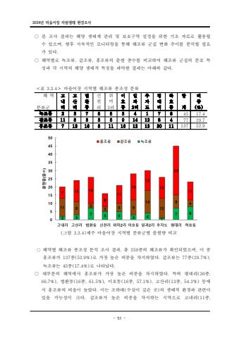 2024%ub144 %ub9c8%uc744%uc5b4%uc7a5 %uc790%uc6d0%uc0dd%ud0dc %ud658%uacbd%uc870%uc0ac- 51 -%u25cb %ubcf8 %uc870%uc0ac %uacb0%uacfc%ub294 %ud574%uc591 %uc0dd%ud0dc%uacc4 %uad00%ub9ac %ubc0f %ubcf4%ud638%uad6c%uc5ed %uc124%uc815%uc744 %uc704%ud55c %uae30%ucd08 %uc790%ub8cc%ub85c %ud65c%uc6a9%ub420%uc218 %uc788%uc73c%uba70 %ud5a5, %ud6c4 %uc9c0%uc18d%uc801%uc778 %ubaa8%ub2c8%ud130%ub9c1%uc744 %ud1b5%ud574 %ud574%uc870%ub958 %uad70%uc9d1 %ubcc0%ud654 %ucd94%uc774%ub97c %ubd84%uc11d%ud560 %ud544%uc694%uac00 %uc788%ub2e4.%u25cb %ud574%uc5ed%ubcc4%ub85c %ub179%uc870%ub958 %uac08%uc870%ub958 %ud64d%uc870%ub958%uc758 %ucd9c%ud604 %uc885%uc218%ub97c %ube44 , , %uad50%ud558%uc5ec %ud574%uc870%ub958 %uad70%uc9d1%uc758 %ubd84%ud3ec %ud2b9%uc131%uacfc %uac01 %uc9c0%uc5ed%uc758 %ud574%uc591 %uc0dd%ud0dc%uc801 %ud2b9%uc9d5%uc744 %ud30c%uc545%ud55c %uacb0%uacfc%ub294 %uc544%ub798%uc640 %uac19%ub2e4. <%ud45c %ub9c8%uc744%uc5b4%uc7a5 3.3.4%uff1e %uc9c0%uc5ed%ubcc4 %ud574%uc870%ub958 %uc885%uc870%uc131 %ubd84%ub958 %ud574 %uc5ed%ubd84%ub958%uad70 %uace0%ub0b4%ub9ac%uace0%uc0b0%ub9ac%ubc95%ud658%ub3d9%uc2e0%ucc9c%ub9ac%uc704%ubbf82%ub9ac%uc774%ud638%ub3d9%uc77c%uacfc2%ub9ac%ucd94%uc790%ub3c4%ud3c9%ub300%ub9ac%ud558%ud6a8%ub3d9%ud569%uacc4%ube44%uc911(%)%ub179%uc870%ub958 2 3 7 5 5 3 4 1 7 8 45 17.4%uac08%uc870%ub958 11 8 3 3 5 9 14 12 8 4 77 29.7%ud64d%uc870%ub958 7 13 16 8 11 16 12 13 30 11 137 52.9( 3.3.4) %uadf8%ub9bc %uc81c%uc8fc %ub9c8%uc744%uc5b4%uc7a5 %uc9c0%uc5ed%ubcc4 %ubd84%ub958%uad70%ubcc4 %ucd9c%ud604%ub7c9 %ube44%uad50%u25cb %ud574%uc5ed%ubcc4 %ud574%uc870%ub958 %uc885%uc870%uc131 %ubd84%uc11d %uc870%uc0ac %uacb0%uacfc %ucd1d %uc885%uc758 %ud574%uc870%ub958%uac00 %ud655%uc778%ub418%uc5c8%uc73c%uba70 %uc774 %uc911 , 259 , %ud64d%uc870%ub958%uac00 %uc885 %ub85c %uac00%uc7a5 %ub192%uc740 %ube44%uc911%uc744 %ucc28%uc9c0%ud558%uc600%ub2e4 %uac08%uc870%ub958%ub294 %uc885 137 (52.9%) . 77 (29.7%), %ub179%uc870%ub958%ub294 %uc885 %ub85c %ub098%ud0c0%ub0ac%ub2e4 45 (17.4%) . %u25cb %ub300%ubd80%ubd84%uc758 %ud574%uc5ed%uc5d0%uc11c %ud64d%uc870%ub958%uac00 %uac00%uc7a5 %ub192%uc740 %ube44%uc911%uc744 %ucc28%uc9c0%ud558%uc600%ub2e4 %ud2b9%ud788 %ud3c9%ub300%ub9ac %uc885 . (30 , 66.7%), (16 , 61.5%), (16 , 57.1%), (13 , 54.2%) %ubc95%ud658%ub3d9 %uc885 %uc774%ud638%ub3d9 %uc885 %uace0%uc0b0%ub9ac %uc885 %ub4f1%uc5d0%uc11c %ud64d%uc870%ub958%uc758 %ube44%uc728%uc774 %ub192%uc558%ub2e4 %uc774%ub294 %uc870%ud558%ub300 %uc218 . ( %uc2ec%uc774 %uae4a%uc740 %uacf3)%uc758 %uc0dd%ud0dc%uc801 %ud658%uacbd%uacfc %uad00%ub828%uc774 %uc788%uc744 %uac00%ub2a5%uc131%uc774 %ud06c%ub2e4 %uac08%uc870%ub958%uac00 %ub192%uc740 %ube44%uc911%uc744 %ucc28%uc9c0%ud558%ub294 %uc9c0%uc5ed%uc73c%ub85c %uace0%ub0b4%ub9ac %uc885 . (11 , %u00b7%ub3d9%uc870%ub958 %u2022%uac08%uc870%ub958 I!%ub179%uc870%ub958 %uace0%ub0b4%ub9ac %uace0%uc0b0%ub9ac %ubc95%ud658%ub3d9 %uc2e0%ucc9c%ub9ac UI,2 %ub9ac %uc774%ud638%ub3d9 %uc5bb%uacfc %ub9ac %ucd94%uc790%ub3c4 %ud3c9%ub300%ub9ac %ud558%ud6a8%ub3d9