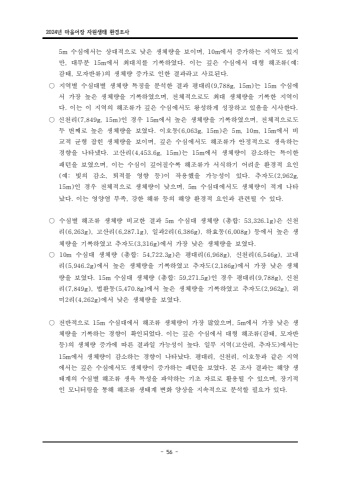 2024%ub144 %ub9c8%uc744%uc5b4%uc7a5 %uc790%uc6d0%uc0dd%ud0dc %ud658%uacbd%uc870%uc0ac- 56 -5m , 10m %uc218%uc2ec%uc5d0%uc11c%ub294 %uc0c1%ub300%uc801%uc73c%ub85c %ub0ae%uc740 %uc0dd%uccb4%ub7c9%uc744 %ubcf4%uc774%uba70 %uc5d0%uc11c %uc99d%uac00%ud558%ub294 %uc9c0%uc5ed%ub3c4 %uc788%uc9c0%ub9cc, 15m . ( %ub300%ubd80%ubd84 %uc5d0%uc11c %ucd5c%ub300%uce58%ub97c %uae30%ub85d%ud558%uc600%ub2e4 %uc774%ub294 %uae4a%uc740 %uc218%uc2ec%uc5d0%uc11c %ub300%ud615 %ud574%uc870%ub958 %uc608:%uac10%ud0dc %ubaa8%uc790%ubc18%ub958 %uc758 %uc0dd%uccb4%ub7c9 %uc99d%uac00%ub85c %uc778%ud55c %uacb0%uacfc%ub77c%uace0 %uc0ac , ) . %ub8cc%ub41c%ub2e4%u25cb %uc9c0%uc5ed%ubcc4 %uc218%uc2ec%ub300%ubcc4 %uc0dd%uccb4%ub7c9 %ud2b9%uc9d5%uc744 %ubd84%uc11d%ud55c %uacb0%uacfc %ud3c9%ub300%ub9ac %ub294 %uc218 (9,788g, 15m) 15m %uc2ec%uc5d0%uc11c %uac00%uc7a5 %ub192%uc740 %uc0dd%uccb4%ub7c9%uc744 %uae30%ub85d%ud558%uc600%uc73c%uba70 %uc804%uccb4%uc801%uc73c%ub85c%ub3c4 , %ucd5c%ub300 %uc0dd%uccb4%ub7c9%uc744 %uae30%ub85d%ud55c %uc9c0%uc5ed%uc774%ub2e4 %uc774%ub294 %uc774 %uc9c0%uc5ed%uc758 %ud574%uc870%ub958%uac00 . . %uae4a%uc740 %uc218%uc2ec%uc5d0%uc11c%ub3c4 %uc655%uc131%ud558%uac8c %uc131%uc7a5%ud558%uace0 %uc788%uc74c%uc744 %uc2dc%uc0ac%ud55c%ub2e4%u25cb %uc2e0%ucc9c%ub9ac %uc778 %uacbd%uc6b0 %uc5d0%uc11c %ub192%uc740 %uc0dd%uccb4%ub7c9%uc744 %uae30%ub85d%ud558%uc600%uc73c%uba70 %uc804%uccb4%uc801%uc73c%ub85c%ub3c4 (7,849g, 15m) 15m , %ub450 %ubc88%uc9f8%ub85c %ub192%uc740 %uc0dd%uccb4%ub7c9%uc744 %ubcf4%uc600%ub2e4 %uc774%ud638%ub3d9 %uc740 %uc5d0%uc11c %ube44 . (6,063g, 15m) 5m, 10m, 15m%uad50%uc801 %uade0%ud615 %uc7a1%ud78c %uc0dd%uccb4%ub7c9%uc744 %ubcf4%uc774%uba70, %uae4a%uc740 %uc218%uc2ec%uc5d0%uc11c%ub3c4 %ud574%uc870%ub958%uac00 %uc548%uc815%uc801%uc73c%ub85c %uc0dd%uc721%ud558%ub294 %uacbd%ud5a5%uc744 %ub098%ud0c0%ub0c8%ub2e4 %uace0%uc0b0%ub9ac %ub294 %uc5d0%uc11c %uc0dd%uccb4%ub7c9%uc774 %uac10%uc18c%ud558%ub294 %ud2b9%uc774%ud55c . (4,453.6g, 15m) 15m%ud328%ud134%uc744 %ubcf4%uc600%uc73c%uba70 %uc774%ub294 %uc218 , %uc2ec%uc774 %uae4a%uc5b4%uc9c8%uc218%ub85d %ud574%uc870%ub958%uac00 %uc11c%uc2dd%ud558%uae30 %uc5b4%ub824%uc6b4 %ud658%uacbd%uc801 %uc694%uc778(%uc608: , ) . (2,962g, %ube5b%uc758 %uac10%uc18c %ud1f4%uc801%ubb3c %uc601%ud5a5 %ub4f1 %uc774 %uc791%uc6a9%ud588%uc744 %uac00%ub2a5%uc131%uc774 %uc788%ub2e4 %ucd94%uc790%ub3c415m) , 5m %uc778 %uacbd%uc6b0 %uc804%uccb4%uc801%uc73c%ub85c %uc0dd%uccb4%ub7c9%uc774 %ub0ae%uc73c%uba70 %uc218%uc2ec%ub300%uc5d0%uc11c%ub3c4 %uc0dd%uccb4%ub7c9%uc774 %uc801%uac8c %ub098%ud0c0%ub0ac%ub2e4 %uc774%ub294 . , . %uc601%uc591%uc5fc %ubd80%uc871 %uac15%ud55c %ud574%ub958 %ub4f1%uc758 %ud574%uc591 %ud658%uacbd%uc801 %uc694%uc778%uacfc %uad00%ub828%ub420 %uc218 %uc788%ub2e4%u25cb %uc218%uc2ec%ubcc4 %ud574%uc870%ub958 %uc0dd%uccb4%ub7c9 %ube44%uad50%ud55c %uacb0%uacfc %uc218 5m ( %uc2ec%ub300 %uc0dd%uccb4%ub7c9 %ucd1d%ud569: 53,326.1g)%uc740 %uc2e0%ucc9c%ub9ac %uace0%uc0b0%ub9ac %uc77c%uacfc %ub9ac %ud558%ud6a8%ub3d9 %ub4f1%uc5d0%uc11c %ub192%uc740 %uc0dd (6,263g), (6,287.1g), 2 (6,386g), (6,008g) %uccb4%ub7c9%uc744 %uae30%ub85d%ud558%uc600%uace0 %ucd94%uc790%ub3c4 %uc5d0%uc11c %uac00%uc7a5 (3,316g) . %ub0ae%uc740 %uc0dd%uccb4%ub7c9%uc744 %ubcf4%uc600%ub2e4%u25cb 10m ( %uc218%uc2ec%ub300 %uc0dd%uccb4%ub7c9 %ucd1d%ud569: 54,722.3g) (6,968g), (6,546g), %uc740 %ud3c9%ub300%ub9ac %uc2e0%ucc9c%ub9ac %uace0%ub0b4%ub9ac %uc5d0%uc11c %ub192%uc740 %uc0dd%uccb4%ub7c9%uc744 %uae30%ub85d%ud558%uc600%uace0 %ucd94%uc790%ub3c4 %uc5d0%uc11c %uac00%uc7a5 (5,946.2g) (2,186g) %ub0ae%uc740 %uc0dd%uccb4%ub7c9%uc744 %ubcf4%uc600%ub2e4 %uc218 . 15m ( %uc2ec%ub300 %uc0dd%uccb4%ub7c9 %ucd1d%ud569: 59,271.5g) (9,788g), %uc778 %uacbd%uc6b0 %ud3c9%ub300%ub9ac %uc2e0%ucc9c%ub9ac %ubc95%ud658%ub3d9 %uc5d0%uc11c %ub192%uc740 %uc0dd%uccb4%ub7c9%uc744 %uae30%ub85d%ud558%uc600%uace0 %ucd94%uc790%ub3c4 %uc704 (7,849g), (5,470.8g) (2,962g), %ubbf8 %ub9ac %uc5d0%uc11c 2 (4,262g) . %ub0ae%uc740 %uc0dd%uccb4%ub7c9%uc744 %ubcf4%uc600%ub2e4%u25cb %uc804%ubc18%uc801%uc73c%ub85c %uc218 15m , 5m %uc2ec%ub300%uc5d0%uc11c %ud574%uc870%ub958 %uc0dd%uccb4%ub7c9%uc774 %uac00%uc7a5 %ub9ce%uc558%uc73c%uba70 %uc5d0%uc11c %uac00%uc7a5 %ub0ae%uc740 %uc0dd%uccb4%ub7c9%uc744 %uae30%ub85d%ud558%ub294 %uacbd%ud5a5%uc774 %ud655%uc778%ub418%uc5c8%ub2e4 %uc774%ub294 . ( , %uae4a%uc740 %uc218%uc2ec%uc5d0%uc11c %ub300%ud615 %ud574%uc870%ub958 %uac10%ud0dc %ubaa8%uc790%ubc18 %ub4f1 %uc758 %uc0dd%uccb4%ub7c9 %uc99d%uac00%uc5d0 %ub530%ub978 %uacb0%uacfc%uc77c %uac00%ub2a5%uc131%uc774 %ub192%ub2e4 %uc77c%ubd80 %uc9c0%uc5ed %uace0%uc0b0%ub9ac %ucd94%uc790%ub3c4 %uc5d0%uc11c%ub294 ) . ( , )15m . , , %uc5d0%uc11c %uc0dd%uccb4%ub7c9%uc774 %uac10%uc18c%ud558%ub294 %uacbd%ud5a5%uc774 %ub098%ud0c0%ub0ac%ub2e4 %ud3c9%ub300%ub9ac %uc2e0%ucc9c%ub9ac %uc774%ud638%ub3d9%uacfc %uac19%uc740 %uc9c0%uc5ed%uc5d0%uc11c%ub294 %uae4a%uc740 %uc218%uc2ec%uc5d0%uc11c%ub3c4 %uc0dd%uccb4%ub7c9%uc774 %uc99d%uac00%ud558%ub294 %ud328%ud134%uc744 %ubcf4%uc600%ub2e4 %ubcf8 %uc870%uc0ac %uacb0%uacfc%ub294 %ud574%uc591 %uc0dd . %ud0dc%uacc4%uc758 %uc218%uc2ec%ubcc4 %ud574%uc870%ub958 %uc0dd%uc721 %ud2b9%uc131%uc744 %ud30c%uc545%ud558%ub294 %uae30%ucd08 %uc790%ub8cc%ub85c %ud65c%uc6a9%ub420 %uc218 %uc788%uc73c%uba70 %uc7a5%uae30%uc801 , %uc778 %ubaa8%ub2c8%ud130%ub9c1%uc744 %ud1b5%ud574 %ud574%uc870%ub958 %uc0dd%ud0dc%uacc4 %ubcc0%ud654 %uc591%uc0c1%uc744 %uc9c0%uc18d%uc801%uc73c%ub85c %ubd84%uc11d%ud560 %ud544%uc694%uac00 %uc788%ub2e4.