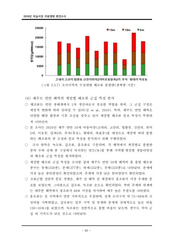 2024%ub144 %ub9c8%uc744%uc5b4%uc7a5 %uc790%uc6d0%uc0dd%ud0dc %ud658%uacbd%uc870%uc0ac- 57 -( 3.3.7) %uadf8%ub9bc %uc870%uc0ac%uc9c0%uc5ed%uc758 %uc218%uc2ec%ub300%ubcc4 %ud574%uc870%ub958 %ucd9c%ud604%ub7c9 %uc0dd%uccb4%ub7c9 %uae30%uc900 ( ) (6) %uc81c%uc8fc%ub3c4 %uc5f0%uc548 %ud574%uc5ed%uc758 %uacc4%uc808%ubcc4 %ud574%uc870%ub958 %uad70%uc9d1 %ud2b9%uc131 %ubd84%uc11d%u25cb %ud574%uc870%ub958%ub294 %uc5f0%uc548 %uc0dd%ud0dc%uacc4%uc5d0%uc11c %ucc28 %uc0dd%uc0b0%uc790%ub85c%uc11c %uc911%uc694%ud55c %uc5ed 1 , %ud560%uc744 %ud558%uba70 %uadf8 %uad70%uc9d1 %uad6c%uc131%uc740 %uacc4%uc808%uc801 %ubcc0%ud654%uc5d0 %ub530%ub77c %ub2ec%ub77c%uc9c8 %uc218 %uc788%ub2e4( e %uae40 t al., 2010). , %ud2b9%ud788 %uc81c%uc8fc%ub3c4 %uc5f0%uc548 %ud574%uc5ed%uc740 %ub2e4%uc591%ud55c %ud574%uc591 %ud658%uacbd%uacfc %uae30%ud6c4 %uc870%uac74%uc744 %uac16%ucd94%uace0 %uc788%uc5b4 %uacc4%uc808%ubcc4 %ud574%uc870%ub958 %ubd84%ud3ec %ud2b9%uc131%uc774 %ub69c%ub837%ud558%uac8c %ub098%ud0c0%ub09c%ub2e4. %u25cb %ubcf8 %uc870%uc0ac%ub294 %ub144 %uc81c%uc8fc %uc5f0%uc548 %uac1c %ub9c8%uc744%uc5b4%uc7a5 %uace0%ub0b4%ub9ac %uace0%uc0b0%ub9ac %ubc95%ud658%ub3d9 %uc2e0%ucc9c%ub9ac %uc704%ubbf8 2024 10 ( , , , , 2 , , 2 , ( ), , ) %ub9ac %uc774%ud638%ub3d9 %uc77c%uacfc %ub9ac %ucd94%uc790 %ud6c4%ud3ec %ud3c9%ub300%ub9ac %ud558%ud6a8%ub3d9 %uc744 %ub300%uc0c1%uc73c%ub85c %uacc4%uc808%uc5d0 %ub530%ub77c %ucd9c%ud604%ud558%ub294 %ud574%uc870%ub958%uc758 %uc885 %uc870%uc131%uacfc %ubd84%ud3ec %ud2b9%uc131%uc744 %ubd84%uc11d%ud558%uae30 %uc704%ud574 %uc218%ud589%ub418%uc5c8%ub2e4.%u25cb , %uc870%uc0ac %ud56d%ubaa9%uc740 %ub179%uc870%ub958 %uac08%uc870%ub958 %ud64d%uc870%ub958%ub85c %uad6c%ubd84%ub418%uba70 , , %uac01 %ud574%uc5ed%uc5d0%uc11c %uacc4%uc808%ubcc4%ub85c %ucd9c%ud604%ud55c %uc885%uc758 %uc218%uc640 %uc804%uccb4 %uc885 %uad6c%uc131%uc5d0%uc11c %ucc28%uc9c0%ud558%ub294 %ube48%ub3c4 %ub97c (%) %ud1b5%ud574 %uc9c0%uc5ed%ubcc4 %uacc4%uc808%ubcc4 %uc0dd%ubb3c%ub2e4%uc591%uc131 %u00b7%uacfc %ud574%uc870%ub958 %uad70%uc9d1 %ud2b9%uc131%uc744 %ud3c9%uac00%ud558%uc600%ub2e4.%u25cb %uacc4%uc808%ubcc4 %ud574%uc870%ub958 %uad70%uc9d1 %ud2b9%uc131%uc744 %uc870%uc0ac%ud55c %uacb0%uacfc %uc81c%uc8fc%ub3c4 %uc5f0%uc548 %uac1c %ud574%uc5ed%uc758 %ucd1d %ucd9c%ud604 %ud574%uc870%ub958 10%uc885%uc218%ub294 %ub3d9%uacc4 %uc885 %ucd98%uacc4 %uc885 %ud558%uacc4 %uc885 %ucd94%uacc4 %uc885 %ub85c %ub098%ud0c0%ub0ac%ub2e4 %ucd98%uacc4%uc5d0 (259 ), (277 ), (252 ), (223 ) . %uac00%uc7a5 %ub192%uc740 %uc885%ub2e4%uc591%uc131%uc774 %ud655%uc778%ub418%uc5c8%uc73c%uba70 %ucd94%uacc4%uc5d0 %uac00%uc7a5 , %ub0ae%uc740 %uc885%ub2e4%uc591%uc131%uc774 %ud655%uc778%ub418%uc5c8%ub2e4. %u25cb %uc870%ub958%uad70%ubcc4 %uc804%ubc18%uc801 %ubd84%ud3ec %uacbd%ud5a5%uc740 %uc81c%uc8fc %uc804 %ud574%uc5ed %uc804 %uacc4%uc808%uc5d0%uc11c %ud64d%uc870%ub958%uac00 %uac00%uc7a5 %uc6b0 , %uc138%ud55c %ubd84%ud3ec%ub97c %ubcf4%uc600%uc73c%uba70, %uadf8%ub2e4%uc74c%uc73c%ub85c %uac08%uc870%ub958 %ub179%uc870%ub958 , %uc21c%uc73c%ub85c %ud655%uc778%ub418%uc5c8%ub2e4 %ud2b9%ud788 %ucd94%uacc4%uc640 %ud558%uacc4%uc5d0 . %ub294 %ub300%ubd80%ubd84 %ud574%uc5ed%uc5d0%uc11c %ud64d%uc870%ub958%uac00 %uc774%uc0c1%uc744 %ucc28%uc9c0%ud558%uba70 %ub9e4%uc6b0 %ub192%uc740 %uc6b0%uc810%ub3c4%ub97c %ub098%ud0c0 80% %ub0c8%ub2e4.%u25cb %ud64d%uc870%ub958%ub294 %uc804 %uc9c0%uc5ed%uc5d0%uc11c %uc5f0%uc911 %uc9c0%uc18d%uc801%uc73c%ub85c %uc6b0%uc810%ud558%uba70 %uc804%uccb4 %uc870%uc0ac%uad6c%uc758 %uc57d %uc758 %uc870 , 75~90%%uc131%ube44%ub97c %uae30%ub85d%ud558%uc600%uace0 %uac08%uc870%ub958%ub294 %uc77c%ubd80 %uc9c0%uc5ed %ubc0f %ub3d9%uacc4%uc640 %ucd98%uacc4%uc5d0 %uc0c1%ub300%uc801%uc73c%ub85c %ub192%uc740 %ube44 , %uc728(20~35%)%uc744 %ubcf4%uc600%uc73c%uba70 %ub179%uc870%ub958%ub294 %uc804%ubc18%uc801%uc73c%ub85c %ucd9c%ud604 %ube44 , %uc728%uc774 %ub0ae%uc73c%uba70 %uc885%uc218%ub3c4 %uc801%uc5b4 %uad70 , %uc9d1 %ub0b4 %uae30%uc5ec%ub3c4%uac00 %ub0ae%uc740 %uac83%uc73c%ub85c %ub098%ud0c0%ub0ac%ub2e4.25OOO OOOOOOO oo 2001501005 1sm %u00b71Om %u00b7,5m %uace0%ub0b4%ub9ac %uace0%uc0b0%ub9ac %ubc95%ud658%ub3d9 %uc2e0%ucc9c%ub9ac%uc6b0 %ub9ac%uc774%ud638%ub3d9%uc77c%uacfc %ub9ac %uc8fc%uc790 %uc815%ub300%ub9ac %ud558%ud6a8%ub3d9