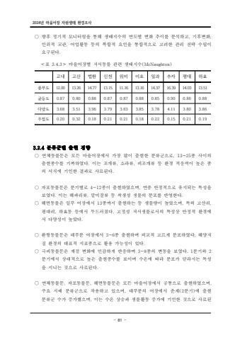 2024%ub144 %ub9c8%uc744%uc5b4%uc7a5 %uc790%uc6d0%uc0dd%ud0dc %ud658%uacbd%uc870%uc0ac- 81 -%u25cb %ud5a5%ud6c4 %uc815%uae30%uc801 %ubaa8%ub2c8%ud130%ub9c1%uc744 %ud1b5%ud574 %uc0dd%ud0dc%uc9c0%uc218%uc758 %uc5f0%ub3c4%ubcc4 %ubcc0%ud654 %ucd94%uc774%ub97c %ubd84%uc11d%ud558%uace0 %uae30, , %ud6c4%ubcc0%ud654%uc778%uc704%uc801 %uad50%ub780, %uc5b4%uc5c5%ud65c%ub3d9 %ub4f1%uc758 %ubcf5%ud569%uc801 %uc694%uc778%uc744 %ud1b5%ud569%uc801%uc73c%ub85c %uace0%ub824%ud55c %uad00%ub9ac %uc804%ub7b5 %uc218%ub9bd%uc774 %uc694%uad6c%ub41c%ub2e4.%uff1c %uff1e %ud45c %ub9c8%uc744%uc5b4%uc7a5%ubcc4 %uc800%uc11c%ub3d9%ubb3c %uad00%ub828 %uc0dd%ud0dc%uc9c0%uc218 3.4.3 (McNaughton)%uace0%ub0b4 %uace0%uc0b0 %ubc95%ud658 %uc2e0%ucc9c %uc704%ubbf8 %uc774%ud638 %uc77c%uacfc %ucd94%uc790 %ud3c9%ub300 %ud558%ud6a8%ud48d%ubd80%ub3c4 12.00 13.26 14.77 13.15 11.16 13.16 14.37 16.39 14.03 13.51%uade0%ub4f1%ub3c4 0.87 0.80 0.88 0.87 0.87 0.88 0.85 0.90 0.86 0.88%ub2e4%uc591%ub3c4 3.68 3.51 3.96 3.79 3.63 3.85 3.78 4.11 3.80 3.86%uc6b0%uc810%ub3c4 0.20 0.32 0.18 0.21 0.21 0.18 0.22 0.15 0.21 0.19 3.2.4 %ubd84%ub958%uad70%ubcc4 %ucd9c%ud604 %uacbd%ud5a5%u25cb %uc5f0%uccb4%ub3d9%ubb3c%ubb38%uc740 %ubaa8%ub4e0 %ub9c8%uc744%uc5b4%uc7a5%uc5d0%uc11c %uac00%uc7a5 %ub9ce%uc774 %ucd9c%ud604%ud55c %ubd84%ub958%uad70%uc73c%ub85c %uc885 %uc0ac%uc774%uc758 , 13~25%ucd9c%ud604%uc885%uc218%ub97c %uae30%ub85d%ud558%uc600%ub2e4 %uc774%ub294 %uc870%uac1c%ub958 %uc18c%ub77c%ub958 . , , %ud53c%uc870%uac1c%ub958 %ub4f1 %ud658%uacbd %uc801%uc751%ub825%uc774 %ub192%uc740 %uc885%uc758 %uc11c%uc2dd%uc5d0 %uae30%uc778%ud55c %uacb0%uacfc%ub85c %uc0ac%ub8cc%ub41c%ub2e4.%u25cb %uc790%ud3ec%ub3d9%ubb3c%ubb38%uc740 %ubd84%uae30%ubcc4%ub85c %uc885%uc774 %ucd9c%ud604%ud558%uc600%uc73c%uba70 %uc5f0%uc911 %uc548%uc815%uc801%uc73c%ub85c 4~12 , %uc720%uc9c0%ub418%ub294 %ud2b9%uc131%uc744 %ubcf4%uc600%ub2e4 %uc774%ub294 %ud574 . , . %ud30c%ub9ac%ub958 %ub9d0%ubbf8%uc798%ub958 %ub4f1 %ucc29%uc0dd%uc131 %uc0dd%ubb3c%uc758 %ubd84%ud3ec%ub97c %ubc18%uc601%ud55c%ub2e4%u25cb %ud574%uba74%ub3d9%ubb3c%uc740 %uc77c%ubd80 %uc5b4%uc7a5%uc5d0%uc11c %uc88513 , , %uae4c%uc9c0 %ucd9c%ud604%ud558%ub294 %ub4f1 %uc0dd%ubb3c%ub7c9%uc774 %ub192%uc558%uc73c%uba70 %ud2b9%ud788 %uace0%uc0b0%ub9ac%ud3c9%ub300%ub9ac %ud558%ud6a8%ub3d9 %ub4f1%uc5d0%uc11c %ub450%ub4dc%ub7ec%uc84c%ub2e4 %uace0%uc815%uc131 %uc800%uc11c%uc0dd%ubb3c%ub85c%uc11c%uc758 %ud2b9%uc131%uc0c1 %uc548%uc815%uc801 %ud658%uacbd%uc5d0 , . %uc11c %ub2e4%uc591%uc131%uc774 %ub192%uc558%ub2e4.%u25cb %ud658%ud615%ub3d9%ubb3c%ubb38%uc740 %ub300%ubd80%ubd84 %uc5b4%uc7a5%uc5d0%uc11c %uc885 %ucd9c%ud604%ud558%uba70 %ube44 3~6 . %uad50%uc801 %uace0%ub974%uac8c %ubd84%ud3ec%ud558%uc600%ub2e4 %ud574%uc591%uc800%uc9c8 %ud658%uacbd%uc758 %ub300%ud45c%uc801 %uc9c0%ud45c%uc885%uc73c%ub85c %ud65c%uc6a9 %uac00%ub2a5%uc131%uc774 %uc788%ub2e4.%u25cb %uadf9%ud53c%ub3d9%ubb3c%ubb38%uc740 %uacc4%uc808 %ubcc0%ud654%uc5d0 %ubbfc%uac10%ud558%uac8c %ubc18%uc751%ud558%uba70 %uc885%uc758 %ubcc0%ub3d9%uc744 %ubcf4%uc600%ub2e4 %ubd84%uae30%uc640 3~8 . 1 2%ubd84%uae30%uc5d0%uc11c %uc0c1%ub300%uc801%uc73c%ub85c %ub192%uc740 %ucd9c%ud604%uc885%uc218%ub97c %ubcf4%uc774%uba70 %uc218%uc628%uc5d0 %ub530%ub77c %ubd84%ud3ec%uac00 %ub2ec%ub77c%uc9c0%ub294 %ud2b9%uc131%uc744 %uc9c0%ub2c8%ub294 %uac83%uc73c%ub85c %uc0ac%ub8cc%ub41c%ub2e4. %u25cb %uc5f0%uccb4%ub3d9%ubb3c%ubb38 %uc790%ud3ec%ub3d9%ubb3c%ubb38 %ud574 , , , %uba74%ub3d9%ubb3c%ubb38%uc740 %ubaa8%ub4e0 %ub9c8%uc744%uc5b4%uc7a5%uc5d0%uc11c %uacf5%ud1b5%uc73c%ub85c %ucd9c%ud604%ud558%uc600%uc73c%uba70%uc8fc%uc694 %uc9c0%ubc30 %ubd84%ub958%uad70%uc73c%ub85c %uc791%uc6a9%ud558%uace0 %uc788%uc73c%uba70 %ub300%ubd80%ubd84%uc758 %uc5b4%uc7a5%uc5d0%uc11c %ucd98%uacc4 %ubd84%uae30 %uc5d0 %ucd9c%ud604 , (2 )%ubd84%ub958%uad70 %uc218%uac00 %uc99d%uac00%ud588%uc73c%uba70 %uc774%ub294 %uc218%uc628 %uc0c1%uc2b9%uacfc %uc0dd%ubb3c , %ud65c%ub3d9 %uc99d%uac00%uc5d0 %uae30%uc778%ud55c %uac83%uc73c%ub85c %uc0ac%ub8cc%ub41c