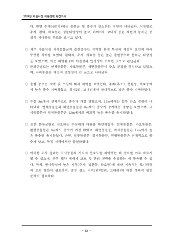 2024%ub144 %ub9c8%uc744%uc5b4%uc7a5 %uc790%uc6d0%uc0dd%ud0dc %ud658%uacbd%uc870%uc0ac- 82 -%ub2e4 %ubc18. (4 ) . %uba74 %ucd94%uacc4 %ubd84%uae30 %uc5d0%ub294 %ucd9c%ud604%uad70 %ubc0f %uc885%uc218%uac00 %uac10%uc18c%ud558%ub294 %uacbd%ud5a5%uc774 %ub098%ud0c0%ub0ac%ub2e4 %uc5b4%uc7a5%ubcc4%ub85c %ucd94%uc790 %ud3c9%ub300 %ud558%ud6a8%ub3d9%uc740 %uc0dd%ubb3c%ub2e4%uc591%uc131%uc774 %ub192%uace0 %uc704%ubbf8 %ub9ac %uace0%ub0b4%ub9ac %ub4f1%uc740 %uc81c%ud55c%uc801 %ubd84%ub958%uad70 %uc911 , , , 2 , %uc2ec%uc758 %uc800%ub2e4%uc591%uc131 %uad6c%uc870%ub97c %ubcf4%uc774%uace0 %uc788%ub2e4. %u25cb %uc81c%uc8fc %ub9c8%uc744%uc5b4%uc7a5 %uc800%uc11c%ub3d9%ubb3c%uad70%uc758 %ucd9c%ud604%uc885%uc218%ub294 %uc9c0%uc5ed%ubcc4 %ud658%uacbd %ud2b9%uc131%uacfc %uacc4%uc808%uc801 %uc694%uc778%uc5d0 %ub530%ub77c %ub69c%ub837%ud55c %ucc28%uc774%ub97c %ubcf4%uc600%ub2e4 %ud3c9%ub300%ub9ac %ucd94%uc790 %ud558%ud6a8%ub3d9 %ub4f1%uc740 %ub192%uc740 %ucd9c%ud604%uc885%uc218%uc640 %ubd84%ub958%uad70 %ub2e4%uc591%uc131 . , , %uc744 %ubcf4%uc600%uc73c%uba70 %uc774%ub294 %ud574%uc591%ud658%uacbd%uc758 %uc774%uc9c8%uc131%uacfc %uc548%uc815%uc131%uc774 %uae30%uc5ec%ud55c , . %uac83%uc73c%ub85c %ud310%ub2e8%ub41c%ub2e4%u25cb %ubd84%ub958%uad70%ubcc4%ub85c%ub294 %uc5f0%uccb4%ub3d9%ubb3c%ubb38 %uc790%ud3ec%ub3d9%ubb3c%ubb38 %ud574 , , %uba74%ub3d9%ubb3c%ubb38%uc774 %uc8fc%uc694 %uad70%uc9d1%uc744 %ud615%uc131%ud558%uace0 %uc788%uc5c8%uc73c%uba70, . %uadf9%ud53c%ub3d9%ubb3c%uc740 %uacc4%uc808%uc801 %ubcc0%ub3d9%uc131%uc774 %ud070 %uad70%uc73c%ub85c %ub098%ud0c0%ub0ac%ub2e4%u25cb %ucd9c%ud604 %uc885%uc218%ub294 %uc9c0%uc5ed %ubc0f %uc218%uc2ec%uc5d0 %ub530%ub77c %ucc28%uc774%ub97c %ubcf4%uc600%ub294%ub370 %ucd94%uc790 , ( ), , %ud6c4%ud3ec %ubc95%ud658%ub3d9 %ud558%ud6a8%ub3d9%uc5d0%uc11c %ub192%uc740 %uc885%uc218 %uae30%ub85d%ud558%uc600%uace0 %uc704%ubbf8 %ub9ac %uace0%ub0b4%ub9ac%uc5d0%uc11c %uc0c1%ub300%uc801%uc73c%ub85c , 2 , . %ub0ae%uc740 %uc885%uc218 %uae30%ub85d%ud558%uc600%ub2e4%u25cb %uc218%uc2ec %uc5d0%uc11c %uc804%uccb4%uc801%uc73c%ub85c %uc885%uc218%uac00 %uac00%uc7a5 %ub9ce%uc558%uc73c%uba70 %uc5d0%uc11c%ub294 %uc77c%ubd80 %uac10%uc18c %uacbd%ud5a5%uc774 %ub098 8m , 12m%ud0c0%ub0ac%ub2e4 %uc5f0%uccb4%ub3d9%ubb3c%ubb38%uacfc %ud574 . 8m , %uba74%ub3d9%ubb3c%ubb38%uc740 %uc5d0%uc11c %uc885%uc218%uac00 %uc99d%uac00%ud558%ub294 %uacbd%ud5a5%uc744 %ubcf4%uc600%uc73c%uba70 %uadf9%ud53c%ub3d9%ubb3c%ubb38%uacfc %ucc99%uc0ad%ub3d9%ubb3c%ubb38%uc740 %uc5d0%uc11c%ub3c4 %ube44 12m . %uad50%uc801 %ub192%uc740 %uc885%uc218%ub97c %uc720%uc9c0%ud558%uc600%ub2e4%u25cb %ub610%ud55c %ubd84%ub958%uad70%ubcc4%ub85c %uc120%ud638%ud558%ub294 %uc218%uc2ec%ub300%uac00 %ub2e4%ub984%uc744 %ud655%uc778%ud558%uc600%ub2e4 %uc5f0%uccb4%ub3d9%ubb3c%ubb38 %uc790%ud3ec%ub3d9%ubb3c%ubb38 . , , %ud658%ud615%ub3d9%ubb3c%ubb38%uc740 %uc5d0%uc11c %uc885%uc218%uac00 %uac00%uc7a5 %ub9ce%uc558%uace0 %ud574 8m , , 12m %uba74%ub3d9%ubb3c%ubb38 %ucc99%uc0ad%ub3d9%ubb3c%ubb38%uc740 %uc5d0%uc11c %ub192%uc740 %uc885%uc218%ub97c %uc720%uc9c0%ud558%uc600%ub2e4 %ubc18. , , , %uba74 %uc131%uad6c%ub3d9%ubb3c%ubb38 %uc808%uc9c0%ub3d9%ubb3c%ubb38 %ud3b8%ud615%ub3d9%ubb3c%ubb38%uc740 %uc804%uccb4%uc801%uc73c%ub85c %uc885%uc218%uac00 %ub0ae%uace0 %ud2b9%uc815 %uc9c0%uc5ed%uc5d0%uc11c , . %ub9cc %ucd9c%ud604%ud558%uc600%ub2e4%u25cb %uc774%ub7ec%ud55c %uc870%uc0ac %uacb0%uacfc%ub294 %uc800%uc11c%ub3d9%ubb3c%uc758 %uc11c%uc2dd%uc9c0 %uc120%ud638%ub3c4%ub97c %ud30c%uc545%ud558%ub294 %ub370 %uc911%uc694%ud55c %uae30%ucd08 %uc790%ub8cc%uac00 %ub420 %uc218 %uc788%uc73c%uba70 %ud5a5, %ud6c4 %ud574%uc591 %uc0dd%ud0dc%uacc4 %ubcf4%ud638 %ubc0f %uad00%ub9ac %uc804%ub7b5%uc744 %uc218%ub9bd%ud558%ub294 %ub370 %ud65c%uc6a9%ub420 %uc218 %uc788%ub2e4 %ud2b9%ud788 %uc885%ub2e4%uc591%uc131%uc774 %ub192%uc740 %uc9c0%uc5ed %ucd94%uc790 %ubc95%ud658%ub3d9 %ud558%ud6a8%ub3d9 %uc5d0 %ub300%ud55c %uc9c0%uc18d%uc801%uc778 %ubaa8 . , ( , , ) %ub2c8%ud130%ub9c1%uacfc %ubcf4%ud638 %ubc29%uc548%uc774 %ud544%uc694%ud558%uba70 %uc885%uc218 %uac10%uc18c %uc9c0%uc5ed %uc704%ubbf8 %ub9ac %uace0%ub0b4%ub9ac %uc5d0 %ub300%ud55c %uc0dd%ud0dc%uc801 %uc6d0%uc778 , ( 2 , )%ubd84%uc11d%uc774 %ud544%uc694%ud558%ub2e4.